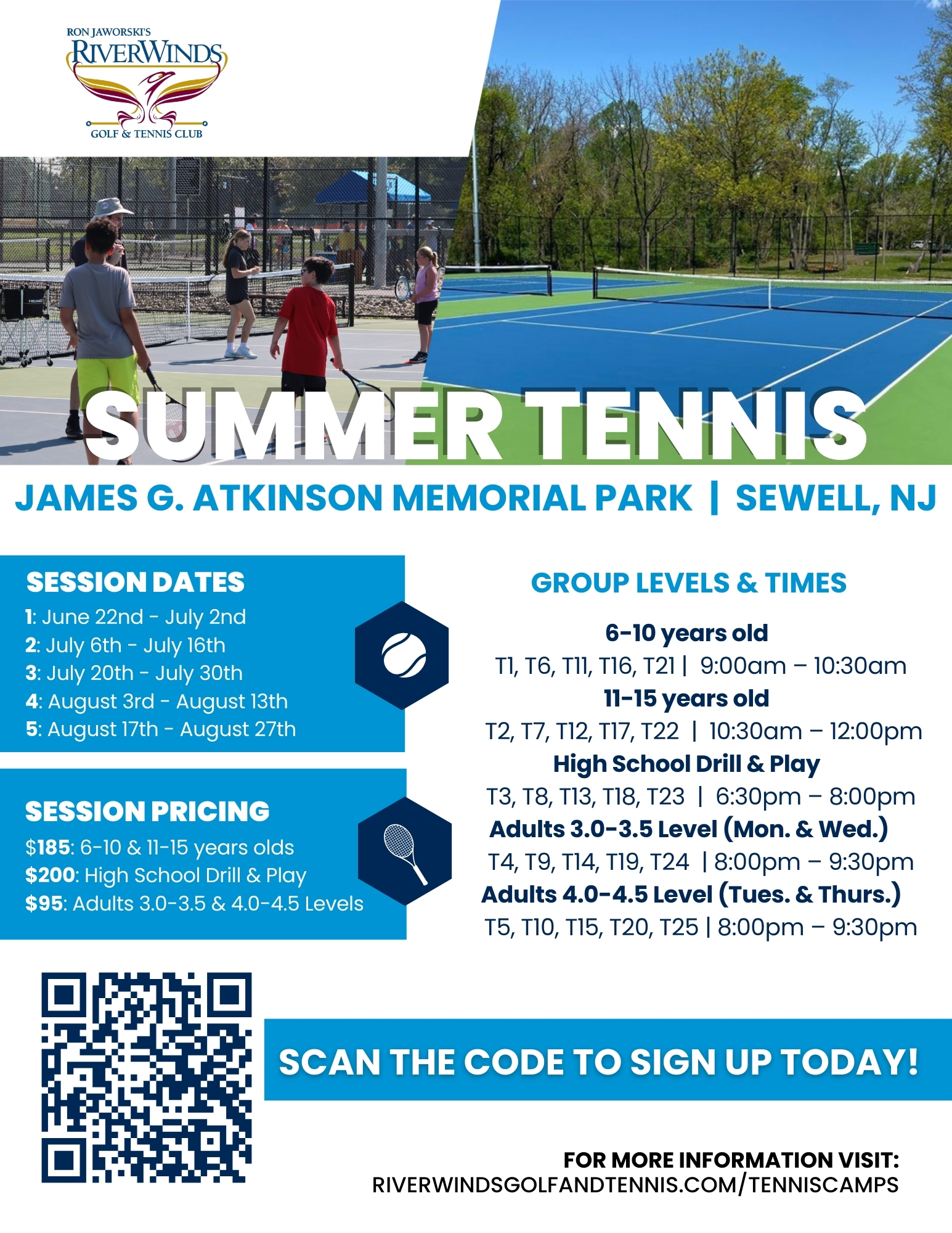 Join us for an exciting summer of tennis at RiverWinds! We’re offering adult Summer Tennis Camps at James G. Atkinson Memorial Park (Sewell, NJ) featuring fun, structured instruction for players across multiple sessions throughout the summer. Atkinson registration opens 3/2/26.