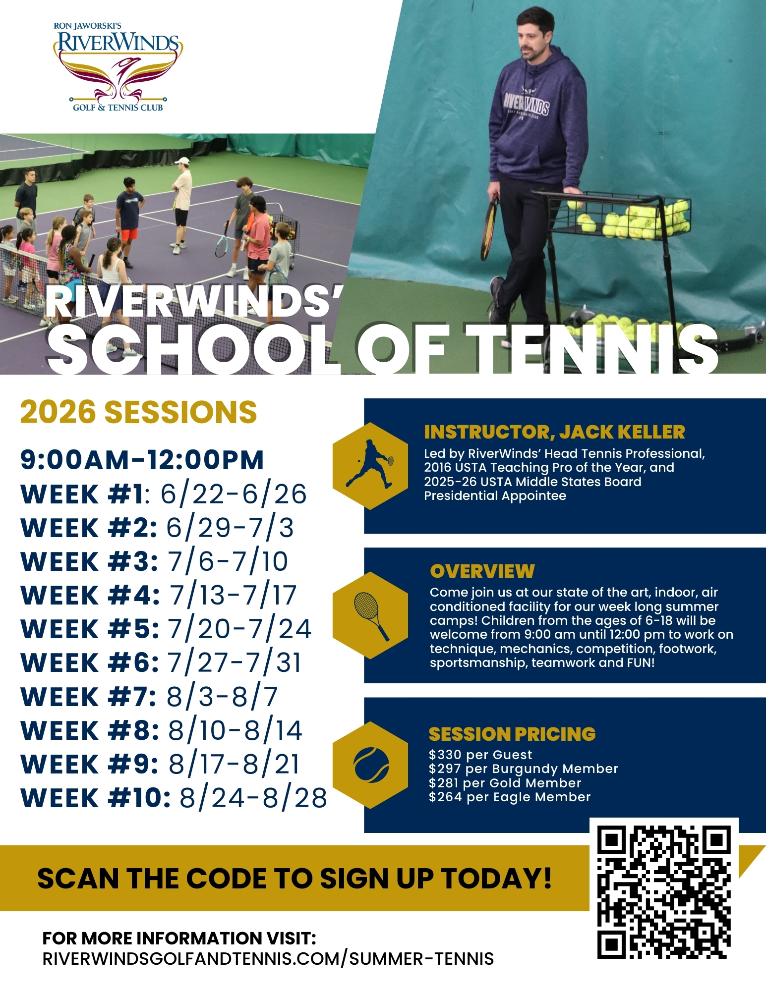 For a premium indoor experience, the RiverWinds School of Tennis provides week-long morning camps of ages up to 18 at our state-of-the-art, air-conditioned facility, led by Head Tennis Professional Jack Keller. Spots are limited—register today and make Summer 2026 your best season yet! Registration opens 2/2/26.